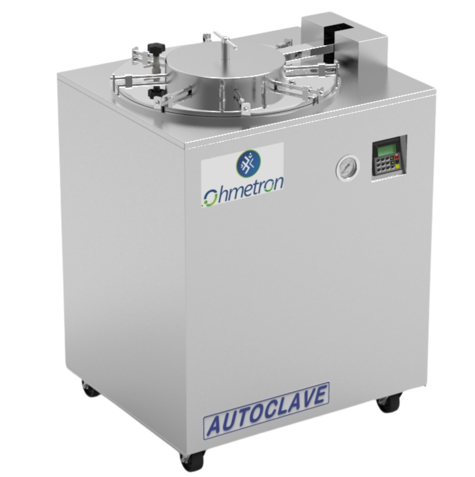 The autoclave supported on Caster wheels.